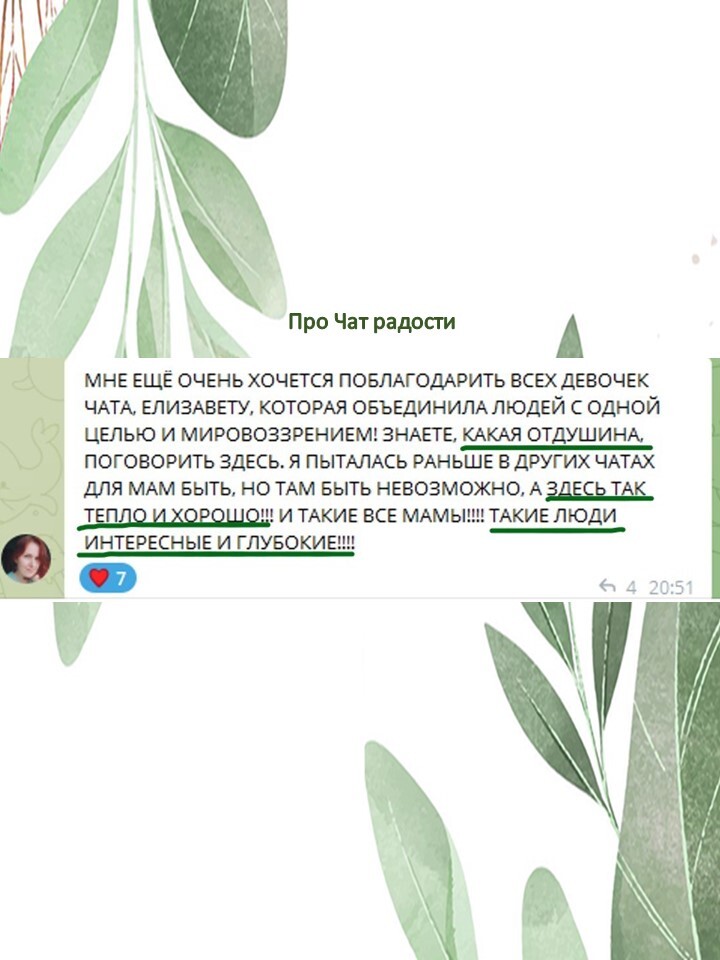 - Чат для поддержки и общения с мамами-единомышленницами участие по желанию.